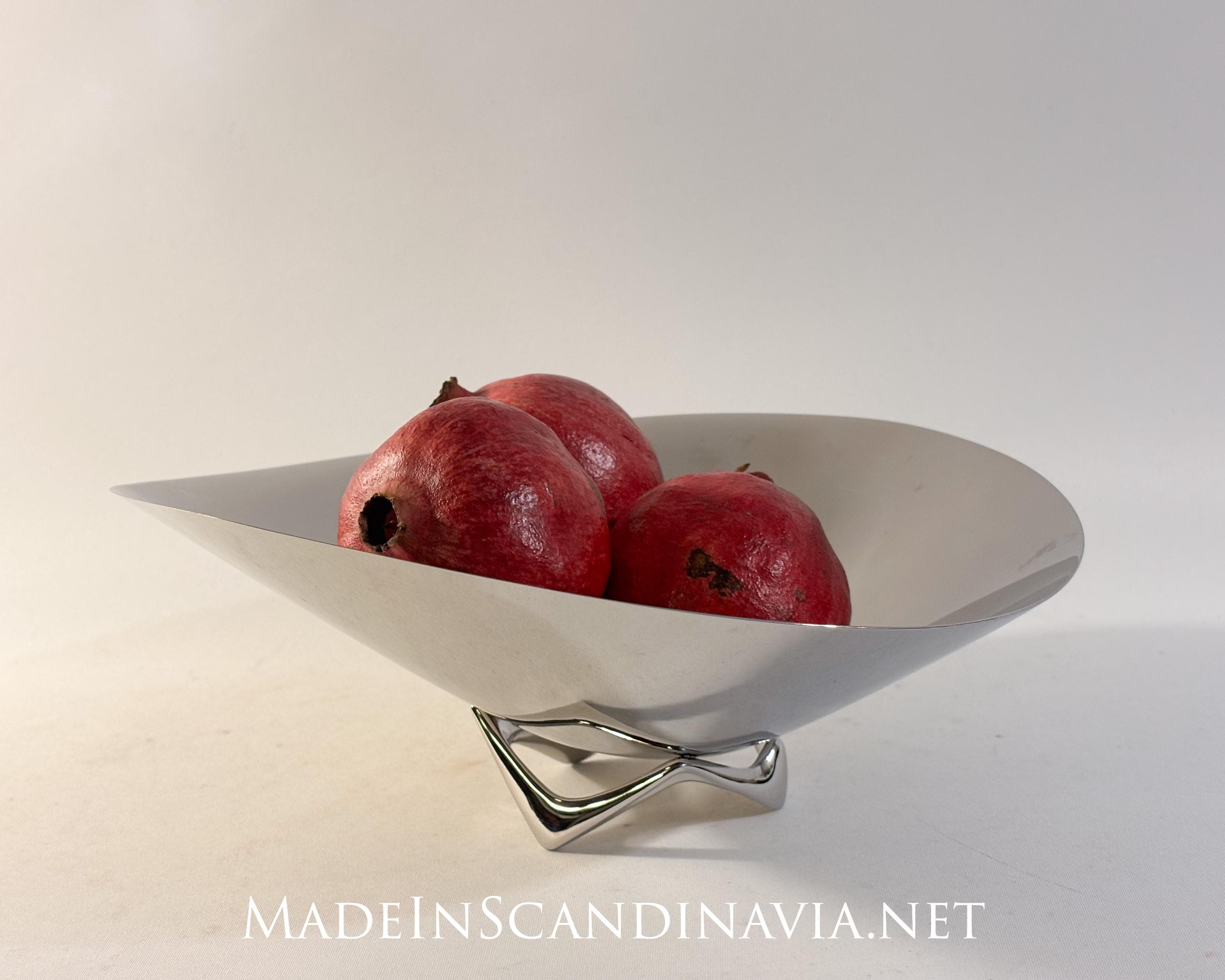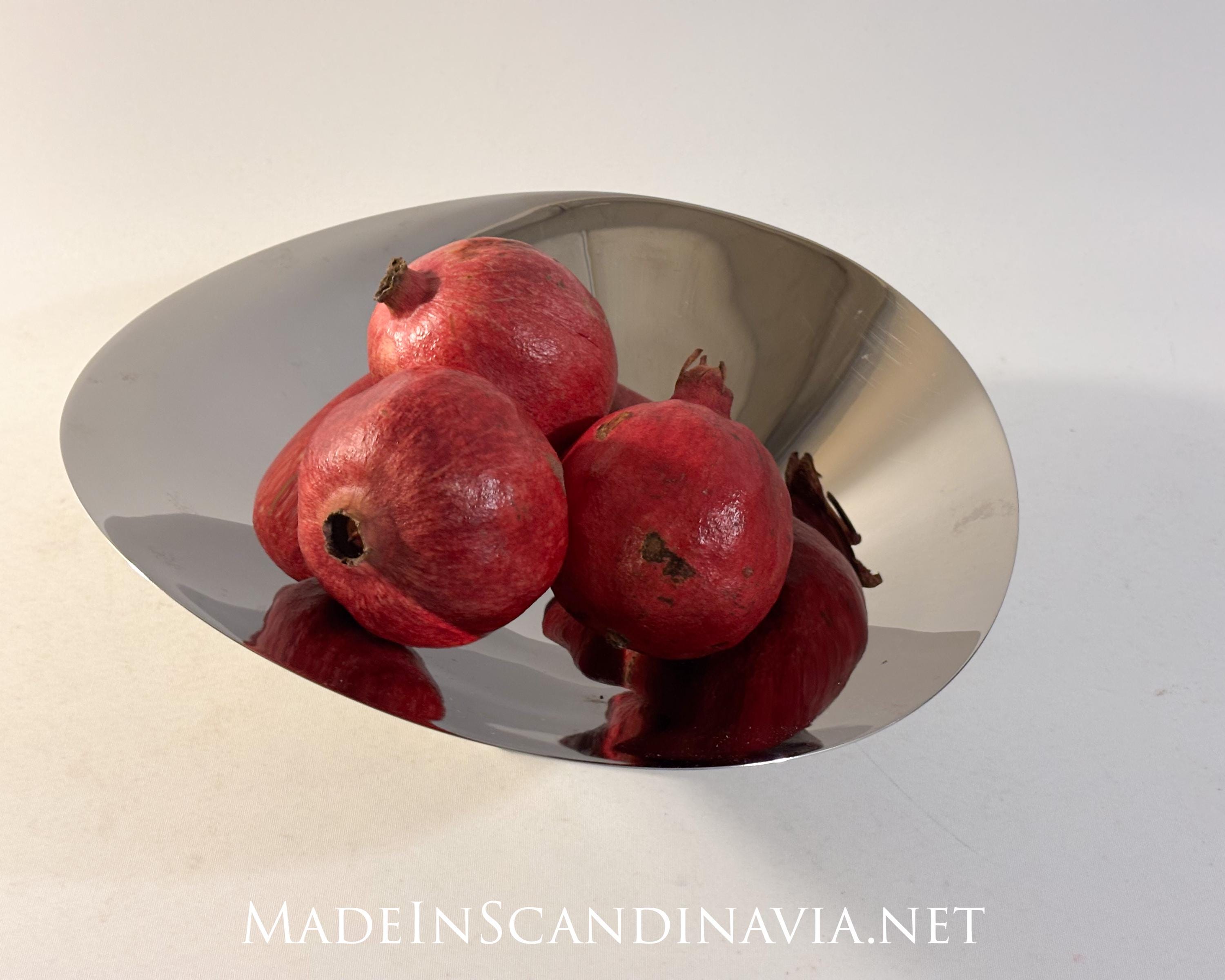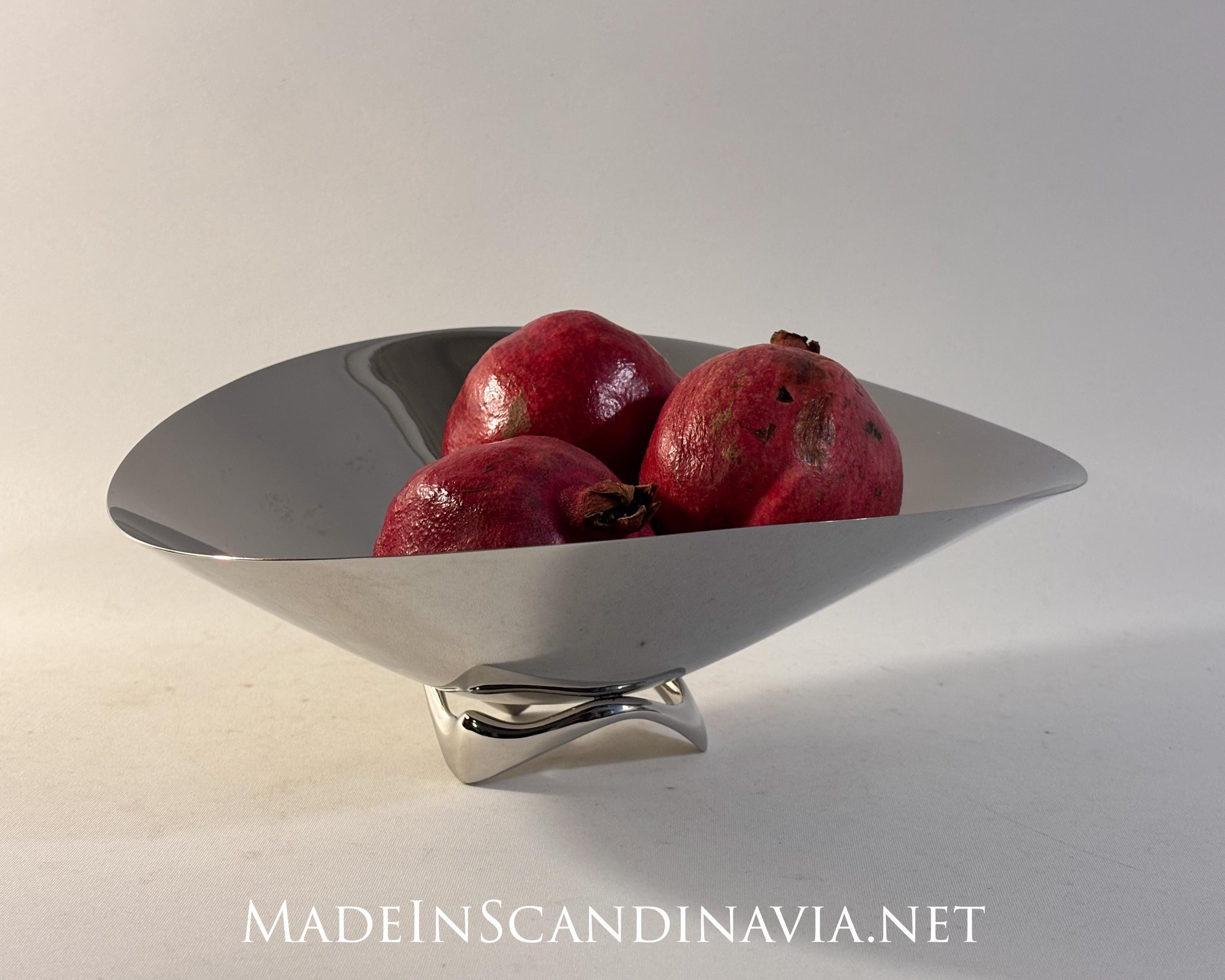 Vividly capturing the movement of the sea, this small decorative bowl makes a striking centrepiece for a table. The fluid, undulating shape seems to almost hover above its stand with the shiny stainless steel surface capturing the light and reflecting the room in which it is placed. The bowl looks as good empty as it does when filled with fruit or flowers and it makes a thoughtful gift to someone who appreciates great interior style.
